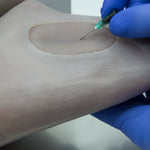 Blood draws and injections can be performed realistically on the anatomically correct placement of the femoral vein. The skin-like vein module also allows for the placement of venous catheters. The saphenous vein on the lower leg becomes visible when compressed – ideal for practice-oriented training scenarios.